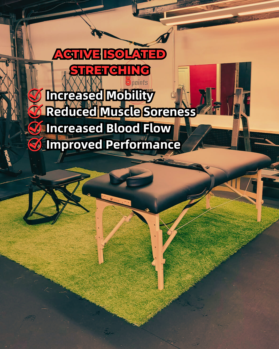Reduce muscle soreness, increase blood flow, improve performance, and increase mobility with active isolated stretching sessions at Five Points. Active Isolated Stretching (AIS) is used worldwide by a variety of personal trainers, athletes, massage therapists, and other health professionals to help repair and restore the body. This method involves a static hold of a stretch with integrated breath work and guided muscle lengthening.
