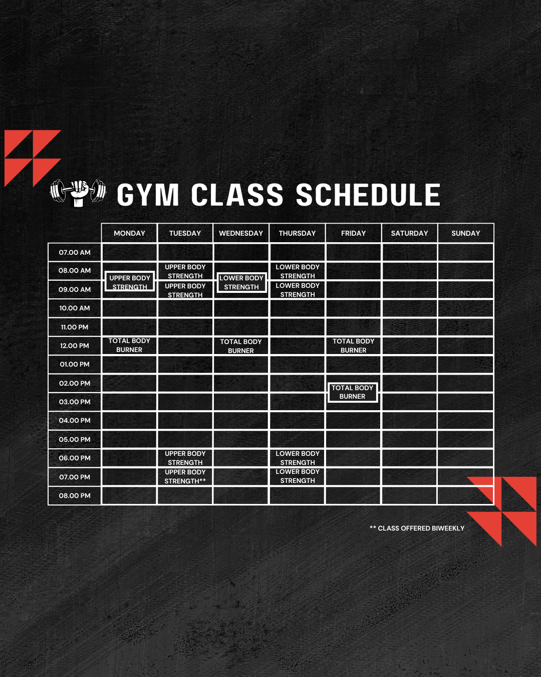Our strength classes are energetic, modifiable, and focused on the foundational movements for long-term strength. Classes are offered every week day at the studio, with preset schedules aimed at revving up your metabolism, melting away excess fat, and sculpting a lean, toned physique.